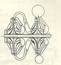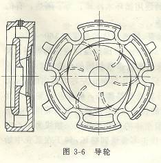 分段式多級(jí)離心泵工作原理:分段式多級(jí)離心泵中段每個(gè)葉輪的外面均安裝有一個(gè)導(dǎo)輪,導(dǎo)輪是一個(gè)固定不動(dòng)的圓盤,它的作用是把從葉輪甩出的液體的一部分動(dòng)能通過減速而轉(zhuǎn)化為靜壓能,并且把這些液體收集后沿徑向回流而導(dǎo)人到下一級(jí)葉輪人口處。尋輪的正面有環(huán)繞在葉輪外緣的正向?qū)~.背面有將液體引向下一級(jí)葉輪人口的反向?qū)~,其結(jié)構(gòu)如圖6所示。